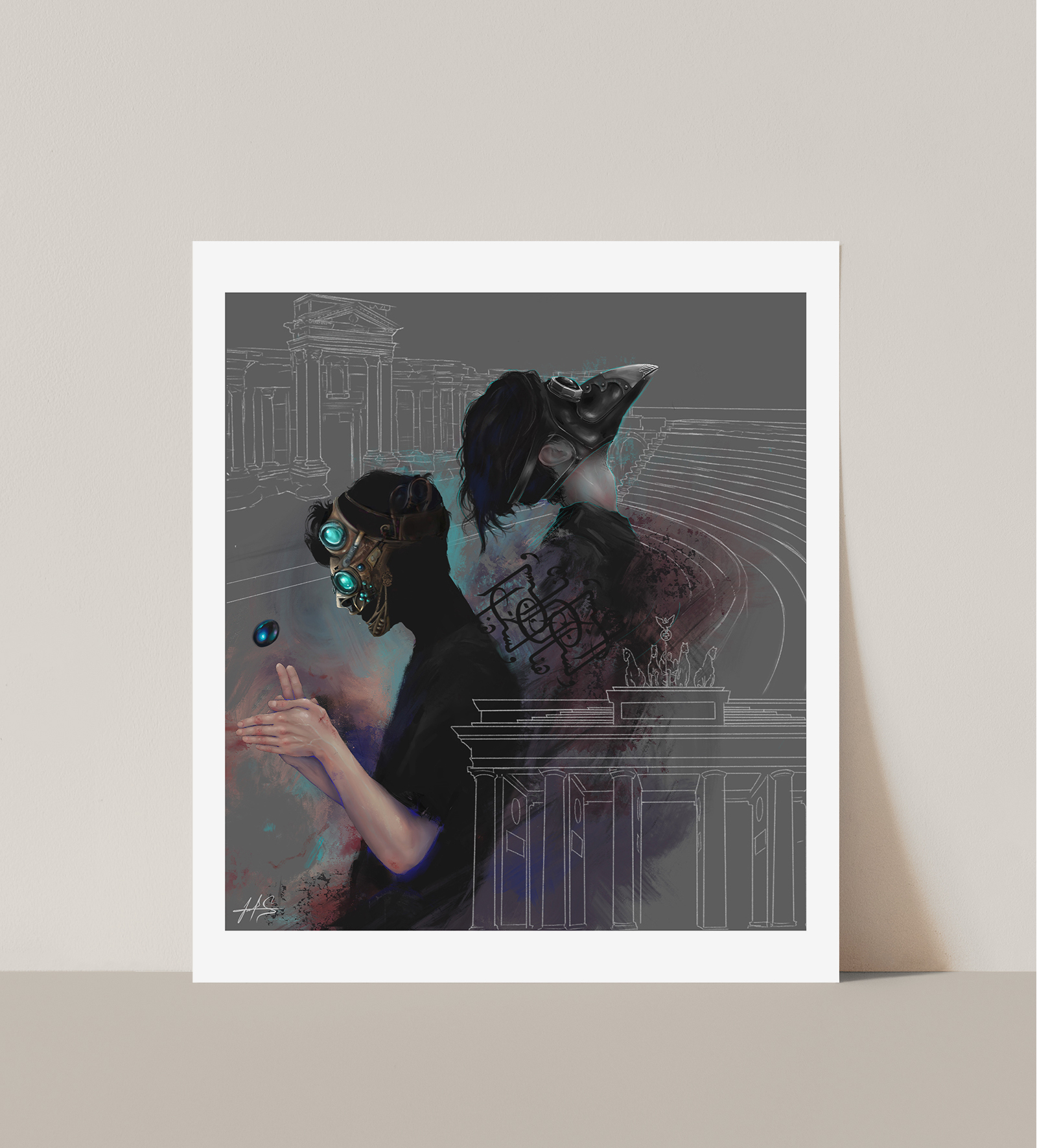 The  semi ego-split is deepened once we consider the place , we see two monuments in the illustration “The Brandenburg Gate” at  Berlin  in Germany and “The Roman Theatre” at Bosra in Syria,  considering these two historical monuments the state of non-determination exceeds one’s self, as if history itself is asking:  which Terre do the “I” belong to ? which one holds in it the tranquility of being?