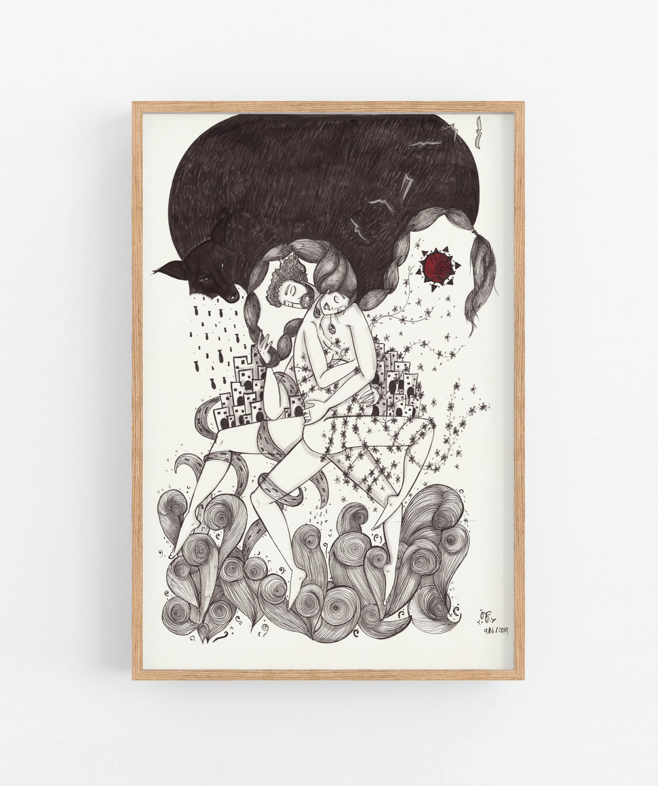 There is a peaceful feeling that inhabits us when we look at Nachawi’s painting “we will live as long”, even though the lovers in carnal union are surrounded with all the reasons of rupture: a haunting wolf in the sky, showers of bombs, rosy-spikey wires and a city floating on the edge of the abyss. the way they are represented reflects harmony and trust something that we lost in our modern world.